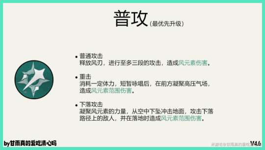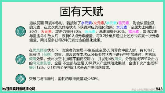 天赋二:释放元素战技的持续期间,普攻有概率获得加速不消耗空居力的效果,并且加速期间释放风矢造成风元素伤害。