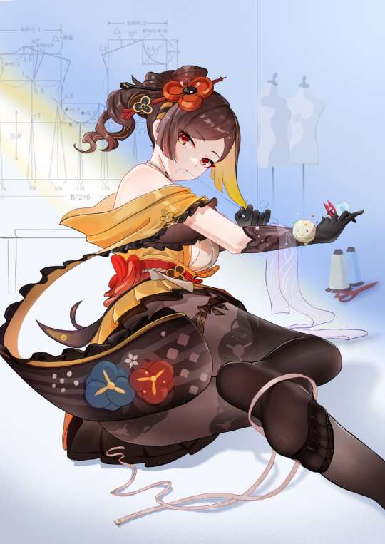 这套千织图共有两个版本,分享一张正常的版本,另外一版本各位旅行者可以通过该画师的主页查看,我真怕审核不通过。看样子千织是在给自己修补服装,由于卷尺的位置比较远,选择用脚勾住了吗。不过话说回来,千织丝袜上面的印花真好看,米家不愧有丝袜专利,太会设计了。