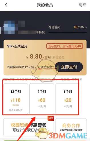 3、进入我的会员界面,选择会员套餐,点击【立即支付】。