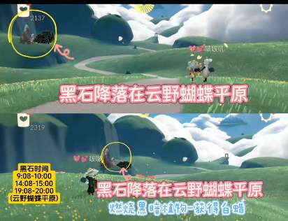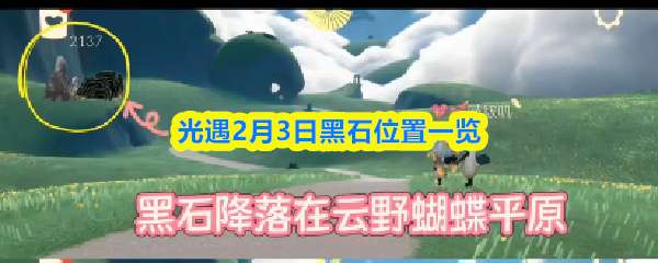 软件提交 专题合集 热门手游光遇2月3日落石位置在云野蝴蝶平原(图一),性质为黑石。出现时段为9:08-10:00、14:08-15:00、19:08-20:00。玩家需在规定时间内前往清理黑暗植物(具体落点为地图随机一处),完成后可获得白蜡烛,但无法完成季节任务。