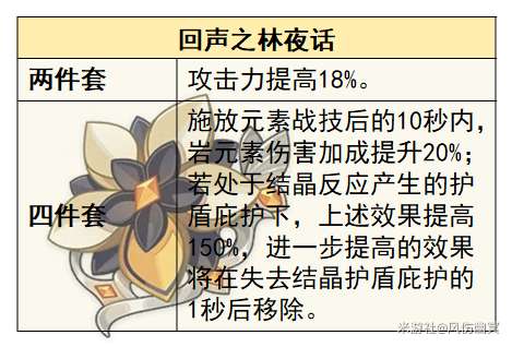 新岩套!很多吃攻击力的岩系老角色都喝汤!并且四件套提升岩伤,处于岩晶盾时还可以提升进一步提升!所以配队时只需要搭配可打岩反应的即可!!