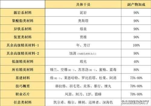 如果大家不想费心思,可以根据以下四种材料直接选择对应的干员,他们每次可以加工12个蓝色材料和8个以上的紫色材料(包括各种稀有度的泥岩材料),并提供额外的9%增幅。这对于许多干员的精英化、某一级专精等需求已经足够了。