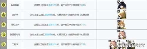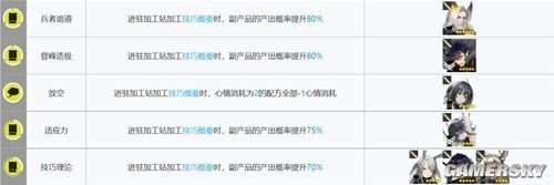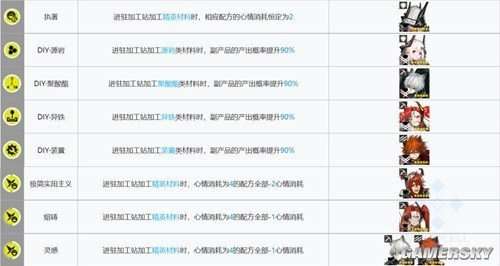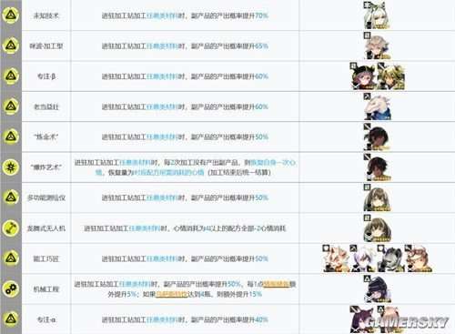 加工站的部署是非常重要的,需要针对不同的道具使用不同的干员进行生产。我们不能一概而论。具体的搭配推荐可以参考下表,但是需要注意的是,每种道具的生产触发条件可能不同,需要大家自己去观察。