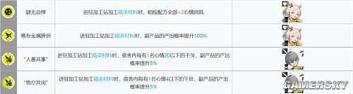 加工站是我们合成高级材料的地方,可以用来进行干员精英化、专精、升级技能和购买家具零件。在过去的七个月中,加工站新增了熔泉、蜜莓、蚀清、罗比菈塔和羽毛笔五位干员。加工站的基建技能可分为精英材料、基建材料、技能概要、芯片和任意类材料五个系列,根据产出的产品不同而变化。