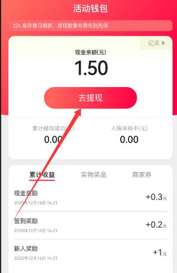 2、进入活动界面后直接点击右侧的【提现】按钮,进入【活动钱包】,选择【去提现】。