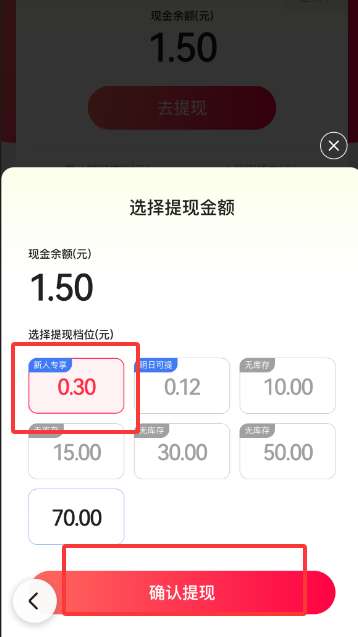 3、选择已经达到的金额,并点击下方的【确认提现】。
