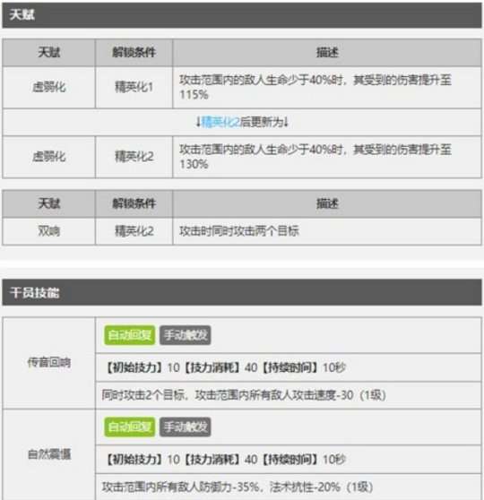 精一职业的天赋“虚弱化”可以使得在攻击范围内血量低于40%的敌人,受到的伤害提升至115%。