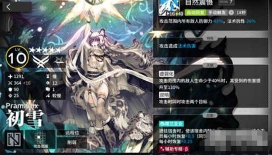 《明日方舟》中辅助职业的定位是提供多种增益或减益的远程支援。虽然没有术士的高额法术输出和狙击手的高额物理输出,但辅助职业的法术攻击通常会带有多种效果,例如暂停和减速,不仅可以对敌方造成削弱,还可以提高自己队伍的战斗力。初雪虽然在二测时表现普通,但在公测中出现了明显的提升,搭配输出效果良好。