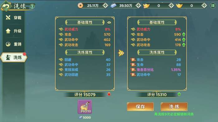 洗炼不仅能进一步提升基础属性,更能在洗炼至一定次数后解锁洗炼词条,一共可解锁6条洗炼词条。