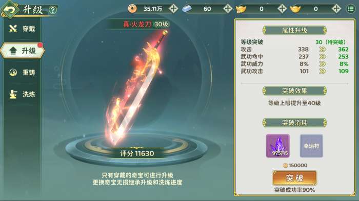 每强化10级,奇宝需要进行突破,突破后可继续升级。奇宝等级越高,突破成功率越低。
