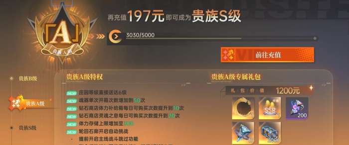 贵族S级和SS这两个等级也是差不多的情况,给的奖励基本都是材料和资源,虽然也有用但不算特别关键。等到了贵族SS级的时候情况就变了,奖励一下子丰富起来,但价格也跳到了200元。这个门槛对大部分玩家来说已经不低了,要不要充就看个人预算了。