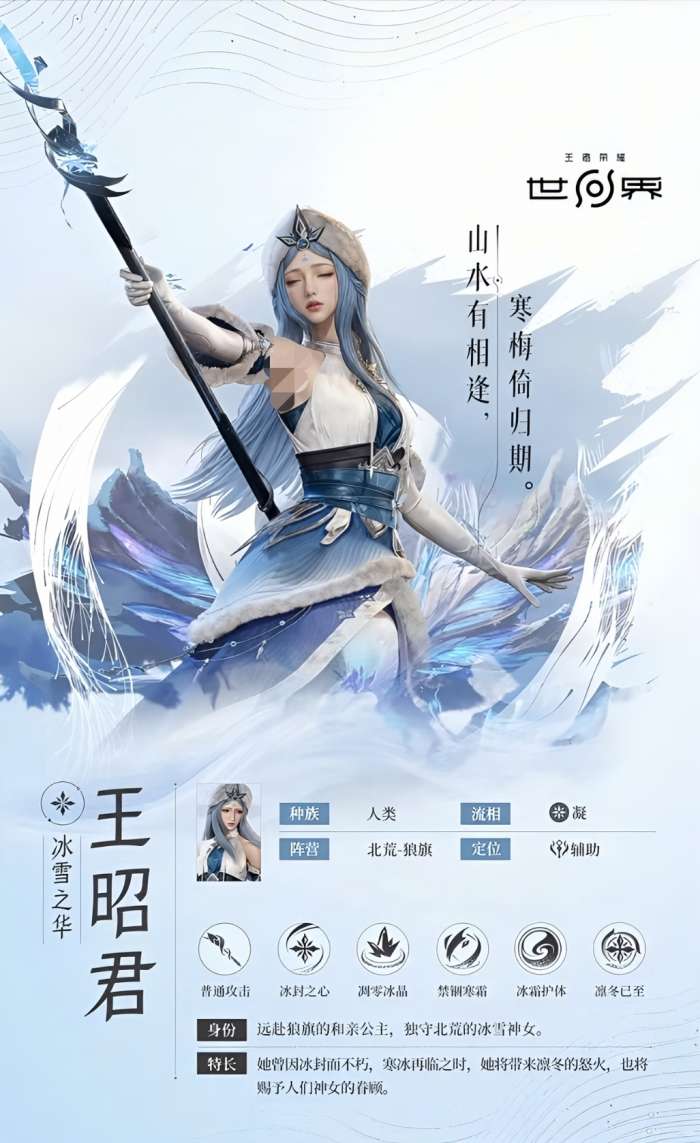 第2个英雄是王昭君,王昭君所具有的普攻会利用冰晶进行输出,蓄力之后会使用冰晶进行发射,冰晶消耗的越多,打出的效果就会越高,它的凋零会对提前设定范围内的目标造成伤害,蓄力后可大幅提高范围和输出力,他的禁锢技能可以输出范围内对敌人的进攻,并且额外添加有冰冻的效果,蓄力使用的冰晶会延长冰冻的时间,增强冰冻的损伤,她的护体能够让自身得到保护,在下一次的对战当中会持续的保留,如果在组队的状态下,还可以跟相近的队友一同产生定量的护盾。