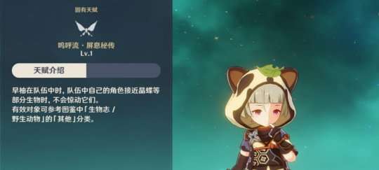 早柚或者瑶瑶在队伍时可以让晶蝶、螃蟹、蜥蜴等小动物变得很难发现玩家