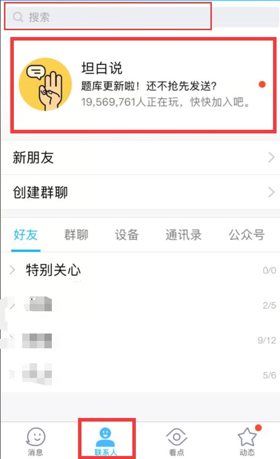 1、打开qq,点击“联系人”,打开“坦白说”,或者点击上面的搜索栏输入“坦白说”也可以进入。