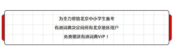 为全力帮助北京中小学生备考,有道词典决定向所有北京地区用户,免费赠送有道词典VIP!可以畅享有道词典的各项强大功能,助力中高考,提高学习效率~