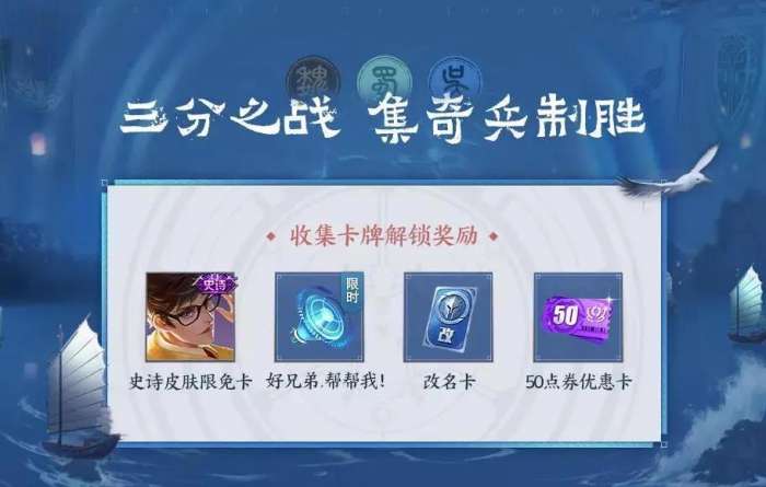 活动期间,通过每日登录活动、完成对局等任务获取魏、蜀、吴对应阵营卡牌,收集一定数量卡牌可得对应阵营奖励,集齐三个阵营所有卡牌可领取“好兄弟,帮帮我!”限时语音、改名卡、50点券优惠卡等最终奖励,更多活动详情请关注游戏内活动。
