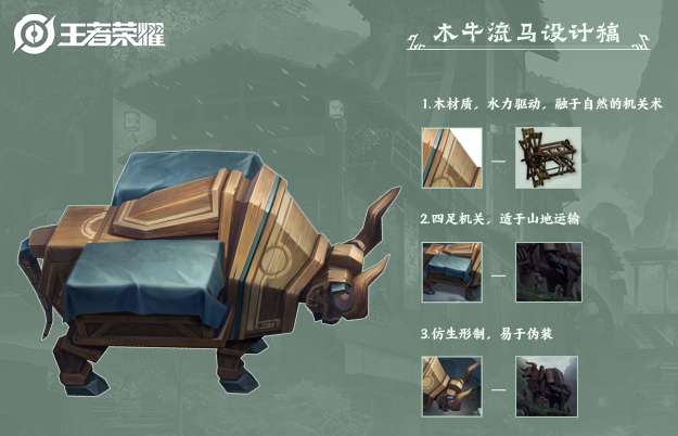 相比于稷下机关术、长安机关术,三分之地中的蜀地机关术一大特点就是主张机关与自然相融合。所以在设计王者中的木牛流马时,我们以木材质作为其主体,采取了古拙的造型,驱动能量则来自于无污染的水动力。再加上木牛流马本身的仿生形制,当它们行走在山林之中时,更是融于自然,难以被敌人发现。