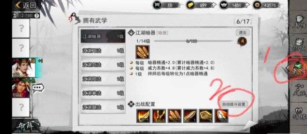 然后打开背包,选择你需要互动的NPC,点击[武学]—[自动战斗设置],如下图所示。