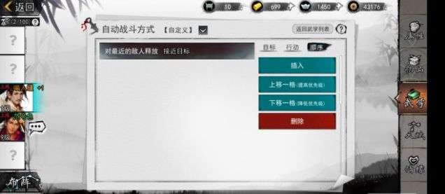 接着点[手动调整]—[顺序]—[删除],把除了[接近目标]之外的武功技能全删了,如下图所示
