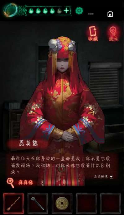 回到病房2011掀开床上的被子,将获得的三个饰品放在盒子上对应的凹槽内,完成后打开盒子拿走里面的「罩子」。接着用打火机点燃红蜡烛并套上罩子,再将碗放在镜子右下角并倒入红墨水。最后根据指南上的提示用圆珠笔敲击瓷碗,完成仪式后获得提示「57」。