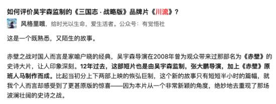 作为一部品牌片,《川流》独具匠心的制作、值得深度解读的剧情和精益求精、细微之处见真章的影游联动属性都很好地树立了一个行业标杆,具有相当的行业影响力,为电影的形式探索了更多全新的可能性。期待《三国志·战略版》新赛季能够给新老玩家更多惊喜。
