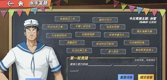 在6月5日水手答题当中有一题的提示是使用三把刀的他,而熟悉海贼王剧情的玩家应该很容易就能够猜出三刀流的是索隆了吧。