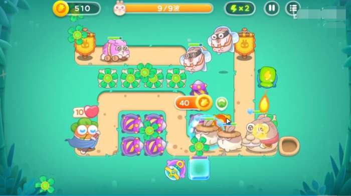 3、开完附近的图后在路径附近种上炮塔,要种两个防空的炮塔,这一关有会飞的兔兔。