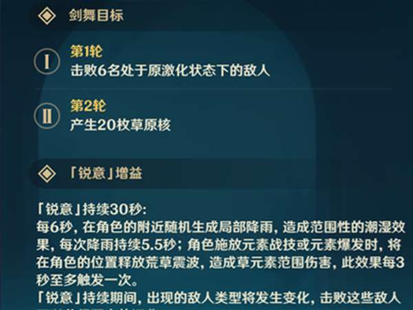 剑舞目标:第一轮,击败6名处于原激化状态下的敌人;第二轮,产生20枚草原核。
