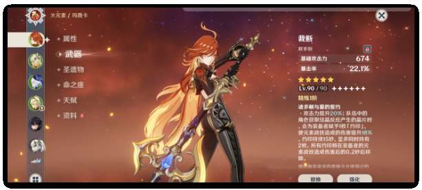 这边举栗精五的极霸剑,副词条没用,但是特效吃满攻击力比精一的裁断还高一点点。裁断只有多22的暴击,而火神不缺暴击。