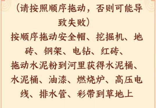 按顺序拖动安全帽、挖掘机、地砖、钢架、电钻、红砖、拖动水泥粉到河里获得水泥桶、水泥桶、油漆、燃烧炉、高压电线、排水管、彩带到草地上