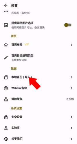 3、进入“设置”界面后,滑至地段,点击本地备份(导入选项);