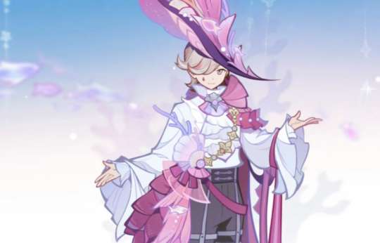 林尼这套更夸张,感觉把克洛琳德的帽子都给偷了过来。原本林尼的配色为黑红,这次变成紫白,给人的感觉都不一样了。身上同样布满了海洋元素,不过男孩子腰部为何要增加一层布料,这应该是枫丹的时风格吧。