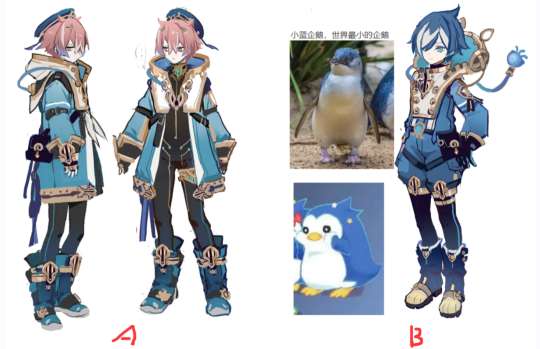 菲米尼的初稿设计非常好看,灵感真的来源于企鹅。整体设计偏向于蓝色,看起来要更加忧郁一些,发色分别使用了红色和蓝色做尝试,最终选择金发更符合枫丹风格。从开始到确定稿件,菲米尼一直都是身穿厚重的潜水装备,核心思路不能变。
