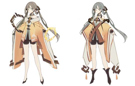 归终最开始的服装设计比较偏向于黄色,并且设计成为了中国风双马尾形象。手部的设计并没有全包,还露出了一部分。衣服外面的套袖非常大,相当有特色,尽管并没有使用草稿这一版,PV中的形象也可引人怜爱。