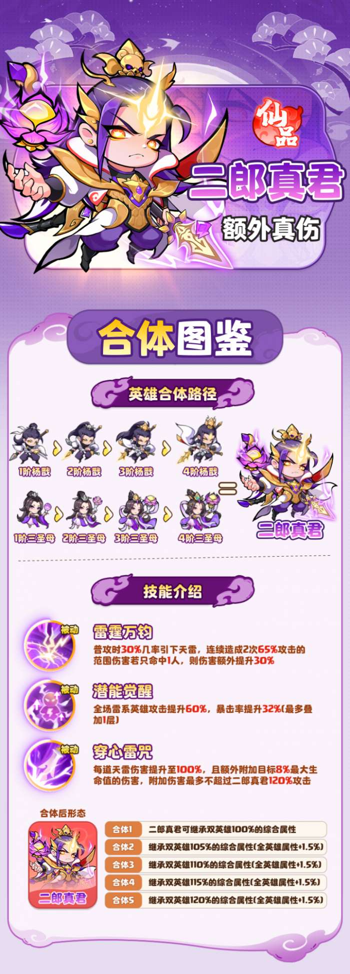 二郎真君的三个技能分别是雷霆万钧、潜能觉醒和穿心雷咒。雷霆万钧的效果是在进行普攻时,有30%的几率引下天雷,连续造成两次65%攻击力的范围伤害,如果此技能只命中一人,则伤害额外提升30%,所以在对付单体目标时也有着很不错的表现。潜能觉醒使得场上的雷系英雄攻击力提升60%,暴击率提升32%。