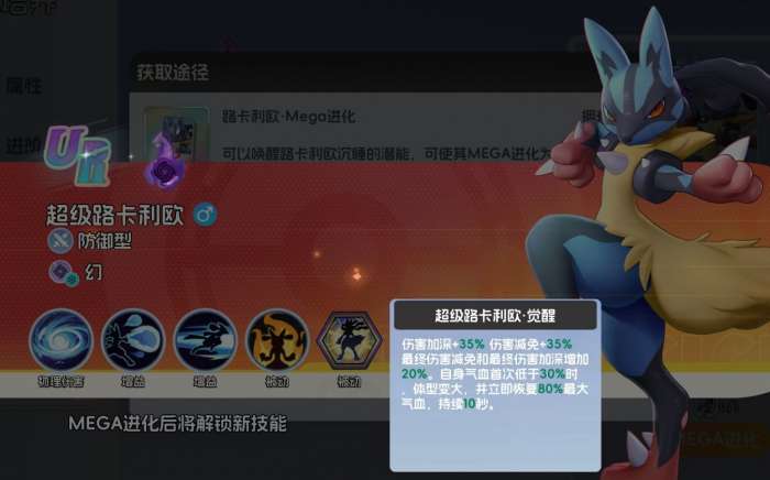 宠物集结中的超级路卡利欧只能通过让利欧路完成MEGA进化来获得,并且它在进化后与其他完成了MEGA进化的宝可梦一样,都能获得一个额外的觉醒技能。该技能初始阶段仅会提供伤害增加5%和伤害减免5%的效果,可一旦玩家将超级路卡利欧的MEGA进化突破到上限,技能的效果会得到极大加强,不光伤害增加和伤害减免都会提升到35%,还能享受到额外的最终伤害减免和最终伤害增加都提高20%的效果,且超级路卡利欧在血量低于30%时体型会变大,并立刻为自己恢复80%的血量,令它能更好地担起承伤的作用。