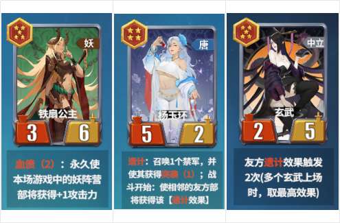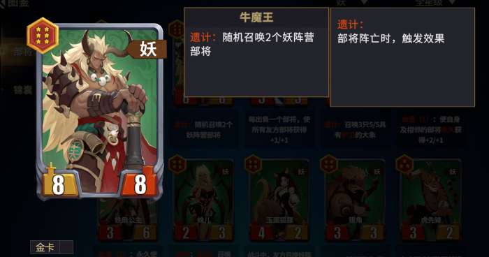 6星牛魔王:召唤随机2个妖族牌。不包含自身共计17张妖族牌,其中白板卡有9张,毒药1张,不屈3张,守卫1张,带遗计召唤物的牌4张,一半的概率出白本,收益一般,6星性价比低。
