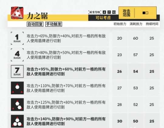 星熊的第二项技能可以显著提高其攻击力和防御力,同时对其前方一格的所有敌人造成伤害,无论它们的数量。星熊通过切割敌人来攻击,从而缩短攻击间隔到1秒,大大提高了其输出能力。这项技能使星熊成为一个具有超高生存能力和无攻击数量限制的群攻近卫。攻击力和防御力都可以在加成后达到1176和1609的最高水平,可以说是攻守兼备的真正强大技能。