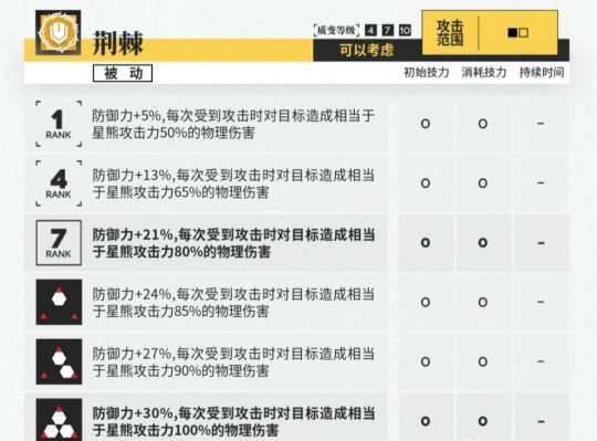 星熊的二技能为罕见的被动型技能,可以增加一定防御。当受到攻击时,星熊能够反弹一定比例基于自身攻击力的伤害。虽然加成比例低,但星熊的防御面板很高,实际提升效果十分显著。随着技能等级的提高,反击比例也会增加。当星熊专精三后,敌人每次攻击星熊时,都会受到一次完整的反击。这种技能特别适合面对攻速高或者大量远程敌人时,具有一定的输出能力。出场时,需要特别注意干员的部署顺序,尽量让星熊后入场,从而吸引更多的火力,以最大限度地发挥技能效果。
