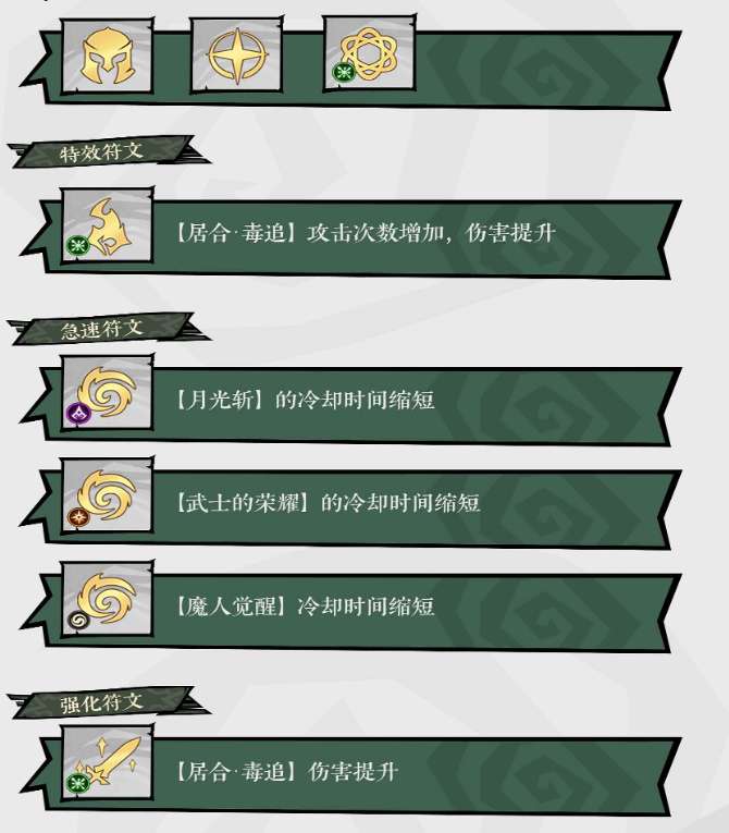 构筑策略分阶段推进:前期采用中毒六件套快速成型;中后期保留毒系两件套以强化“居合·毒追”的基础伤害,并混搭毒刀专属两件套与其他高伤散件。技能配置上,“居合·毒追”为绝对核心,具备超广范围与高触发频率;太刀类技能CD短于法师,但蓝耗显著上升,因此需通过被动技能进一步提升居合伤害并降低1技能能耗。主宰技前期选用“裂霜延斩”施加易伤,后期替换为“风行者”提升机动与连击效率;守护技推荐点出奥义,显著增强整体输出循环效率。
