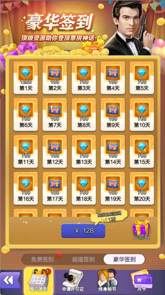 6:双月卡秘书,如果玩下来觉得游戏确实是符合自己的要求,能坚持玩下去的话,就可以入手一下双月卡,说一下双月卡的好处,第一可以屯钻石,第二可以获取两个五星艺人跟两个四星艺人,第三就是玩家前期可能会比较缺乏拍摄券,至尊月卡有个特供礼包可以每天在不够用的时候购买,是额外给出的。第四好处就是购买两个月卡可以获得双月卡的3个特权,增加剧本改编次数(前期剧本改编对票房加成绝对的作用),增加剧本刷新次数(刷新出好的剧本也是前期拍出好票房的关键所在)增加导演自动拍摄次数(前期有时候没空拍电影,自动拍摄真的会方便很多人,点击一键拍摄以后就可以让系统继续刷新拍摄券,避免前期漏券拍摄,减少许多美元的收益!)超值月卡每月可以领取2550钻石,至尊月卡每月可以领取9750钻石,等于双月卡128元每月可以领取12300钻石,还能获取很多特殊权益,对于新手期也非常友好,根据自身需求购买仅供参考