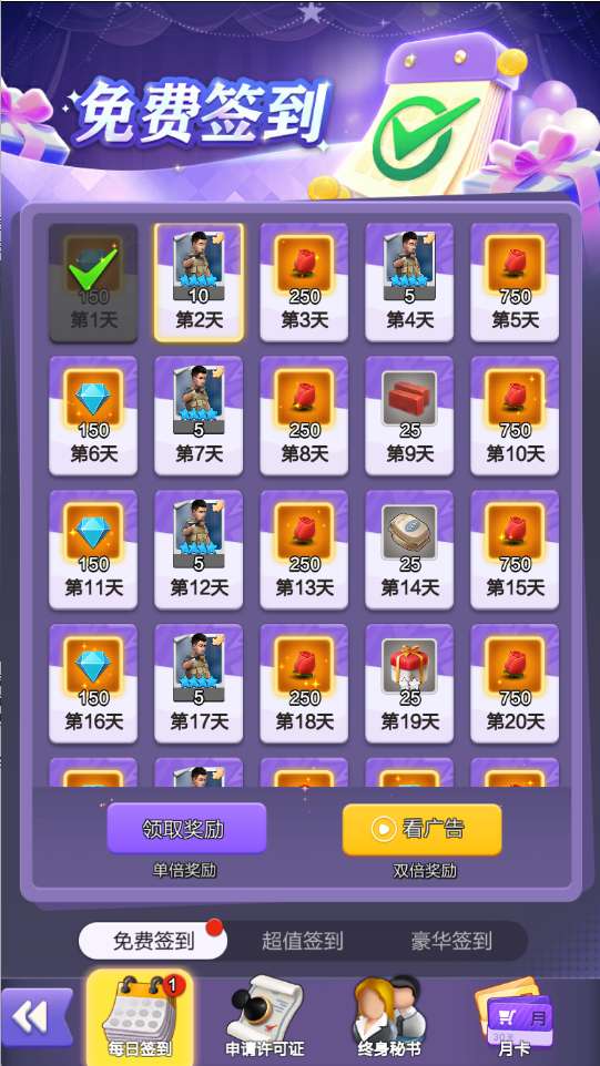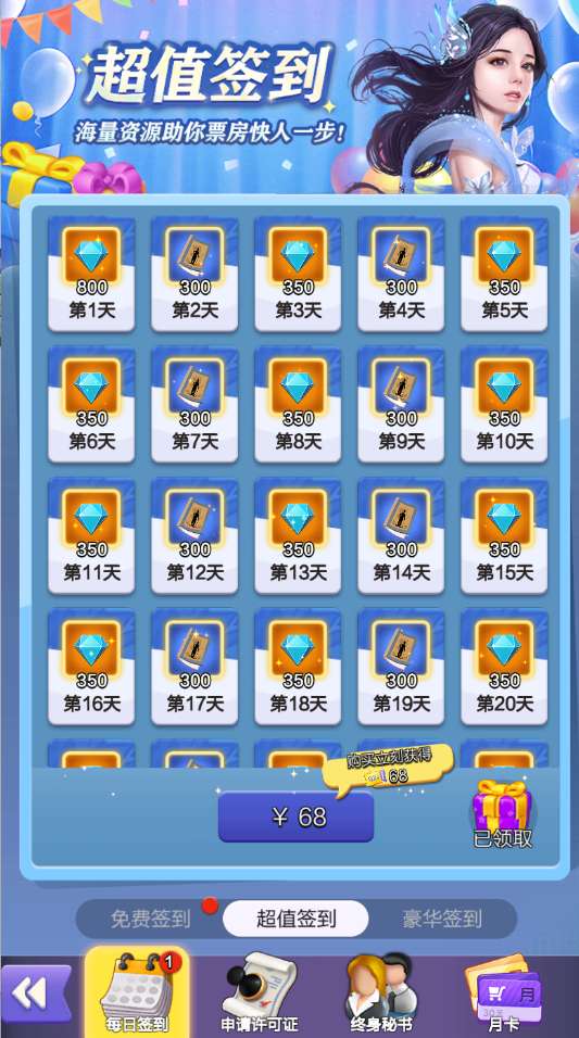 4:每日签到中有个看广告领双倍奖励的按钮,领取之前一定要点击这个按钮,30天可以屯下2400钻石,有条件的玩家也可以按照自己需求购买旁边的超值签到以及豪华签到,超值签到每月可以领取6750钻石,豪华签到每月可以领取13100钻石,个人感觉新手期这两个签到有条件都可以入手,非常划算,日常648代金券才能拿到7280钻石,签到仅需68元就可以拿到,对于屯资源的来说非常友好!