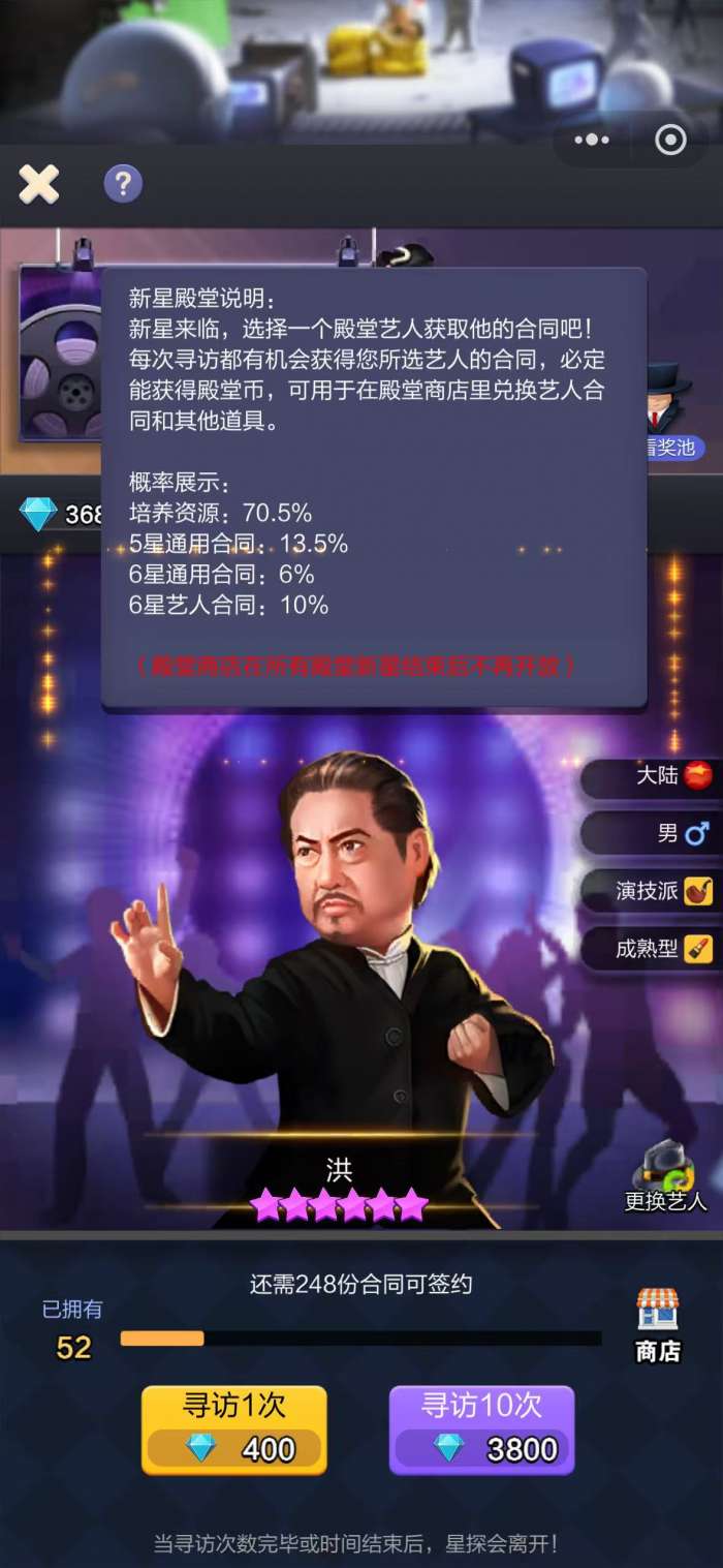 新星殿堂规则与殿堂星探有差距,不是固定说19w指定保底,这个是大概数值,3800钻石10连抽,抽到整个艺人出来大概需要16-19w钻石,大概评估,新星殿堂很有性价比,3800钻石边抽可以边出6通合同和选择的6星艺人的碎片,还有好友册等等,前期玩家存取6通合同可以全部通过这个卡池去获取