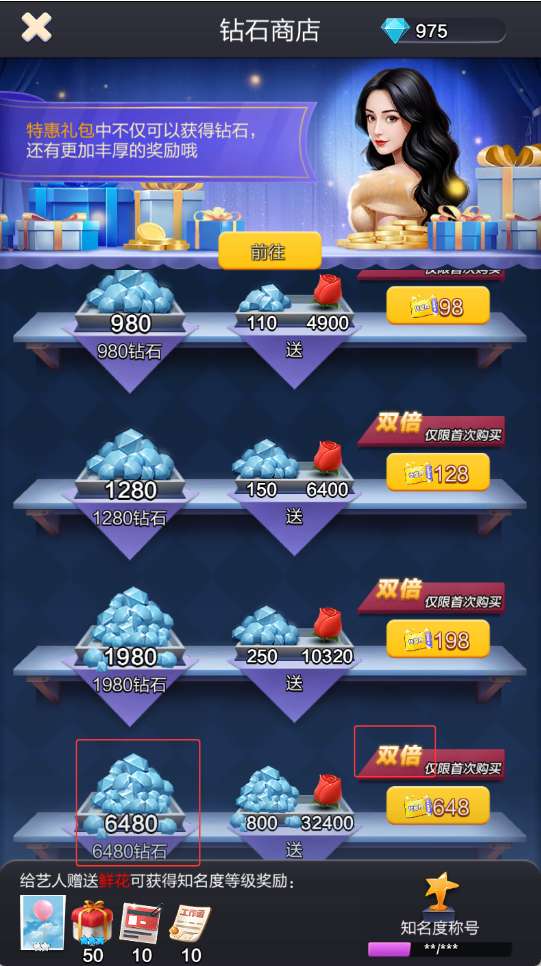 7:首充双倍钻石,新手有个首充双倍钻石,首次购买可以获得两倍的钻石数量,一个648元可以获得13760钻石,这个也是获取钻石比较划算的通道