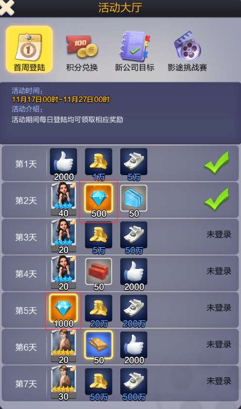2:首周7日登录签到可以免费领取1500钻石,就算没时间也要每天上去点一下签到奖励哦
