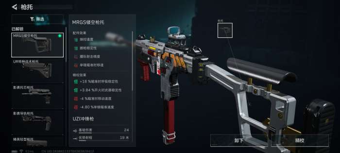 枪托选择MRGS镂空枪托。这个枪托虽然减少一定的开举镜瞄准时移速以及腰际射击精准度,但是可以增加操控速度以及据枪稳定性。接下来是枪械精校: