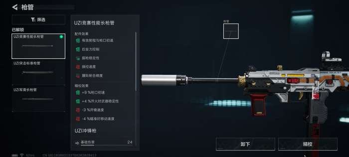 枪管选择UZI竞赛新性长枪管。这个配件和枪口共同搭配,能使UZI的优势射程提升到了十九米,并且再一次提升枪械的稳定性。对于枪口和枪管带来的大额负面操控速度,在操控速度六十八的UZI面前不值得一提。