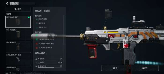 前握把选择相位战斗前握把。这个握把在没有任何负面属性的情况下小幅度提升UZI的操控速度、后坐力控制以及据枪稳定性。