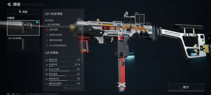 弹夹选择UZI 45发弹匣。在25发的基础上增加了20发,虽然有大幅度的负面属性,但是对于UZI来说可以忽略不计并且还可以提升续航以及容错率。