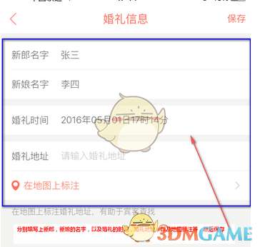 3、接着分填写新郎,新娘的名字,时间,以及宴会酒店地址,和地图标注等